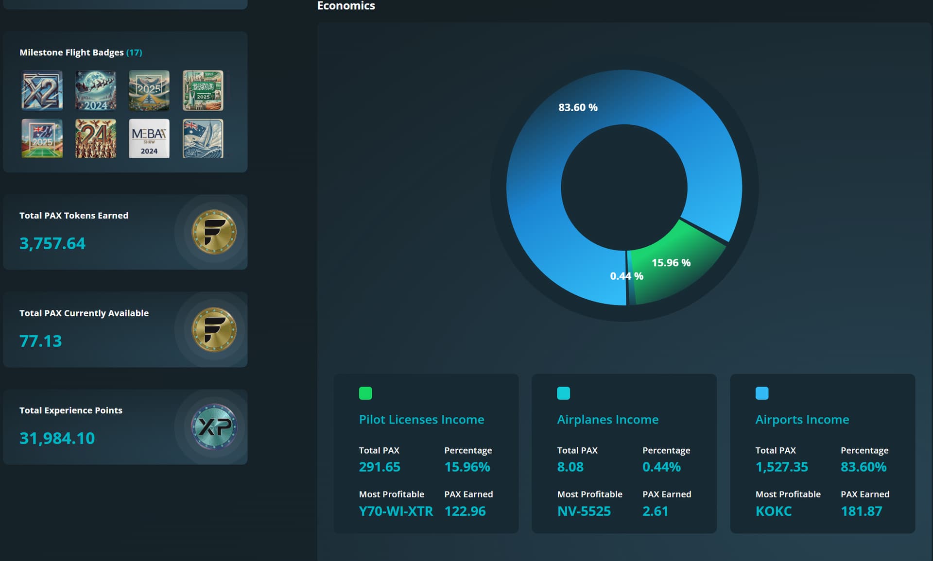 In the screenshot below, the UI indicates I have earned 3757 PAX but adding the income from licenses, airplanes, and airports, the total should be closer to 2740 PAX (given my airports have 60% pilot payout).