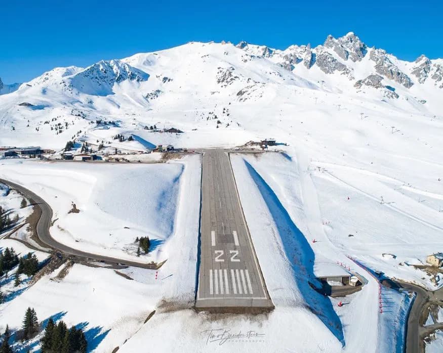 one of the most dangerous airports in the world and in FRANCE this airport is famous for its steep slope and short runway. Courchevel airport ICAO CODE LFLJ this is the video https://www.youtube.com/watch?v=Uw7eBmi1Lt8