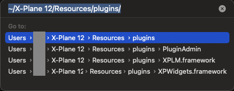 D) press on Shift-Command-G and enter this string (without quotes): “~/X-Plane 12/Resources/plugins/” (Adjust the path if you use a different X-Plane version or plugin folder.)