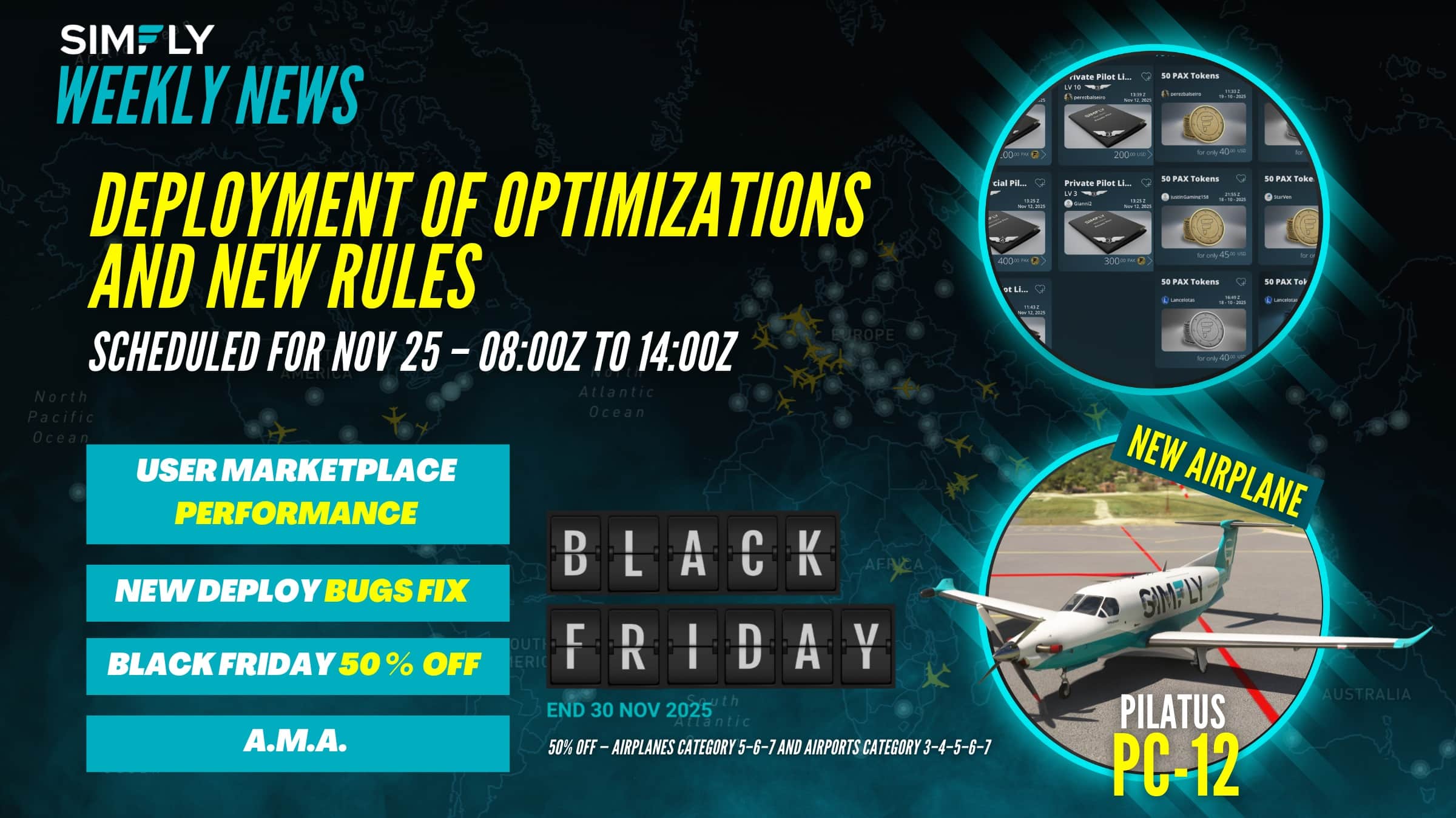 We are finalizing the last interface adjustments for the release of aircraft trading on the User Marketplace: we are very close, and during the first week of December we will announce the release date. Airports will follow right after.